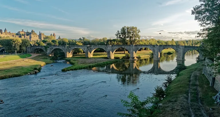 Foto di Txllxt TxllxT. Il Pont Vieux collega la Cité medievale alla Bastide Saint-Louis attraversando il fiume Aude. Costruito nel XIV secolo, è uno dei ponti più antichi e pittoreschi della regione. Attraversarlo a piedi offre una vista magnifica sulla cittadella fortificata, soprattutto al tramonto, quando le torri si tingono di luce dorata.